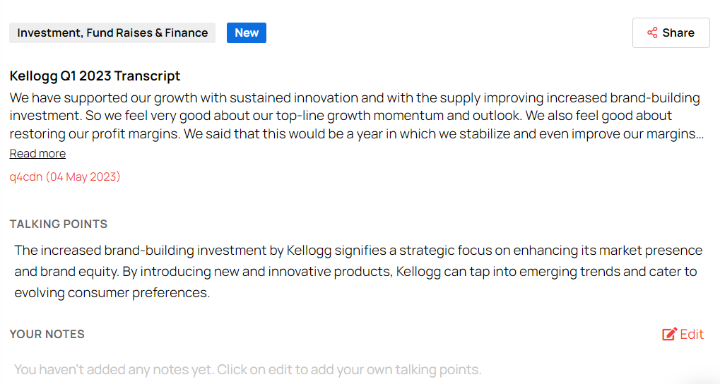 Kellogg’s Q3 2022 results showed continued investment and expansion in plant-based options. The company has been investing in its MorningStar Farms brand, which offers plant-based burgers, sausages, and other products. The company’s investment in plant-based options aligns with consumer trends towards healthier and more sustainable food options, which paves way for other industries whose goals aligns with Kellogg’s expansion plans. If you are prospecting and in Food Tech, this might be a great opportunity to explore Kelloggs.