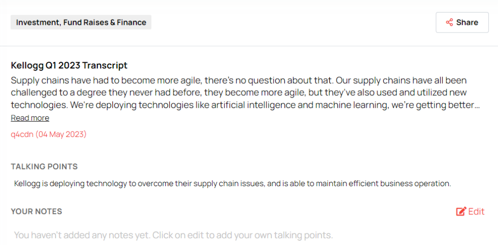 While Kellogg’s revenue growth was strong, the company faced challenges in its supply chain during Q4 2022. The company reported that supply chain disruptions and increased costs impacted its margins during the quarter. Kellogg’s management stated that they are working to address these challenges through increased investments in technology and process improvements. The company could potentially benefit from partnerships with solutions in supply chain management and logistics to improve its operations and reduce costs.