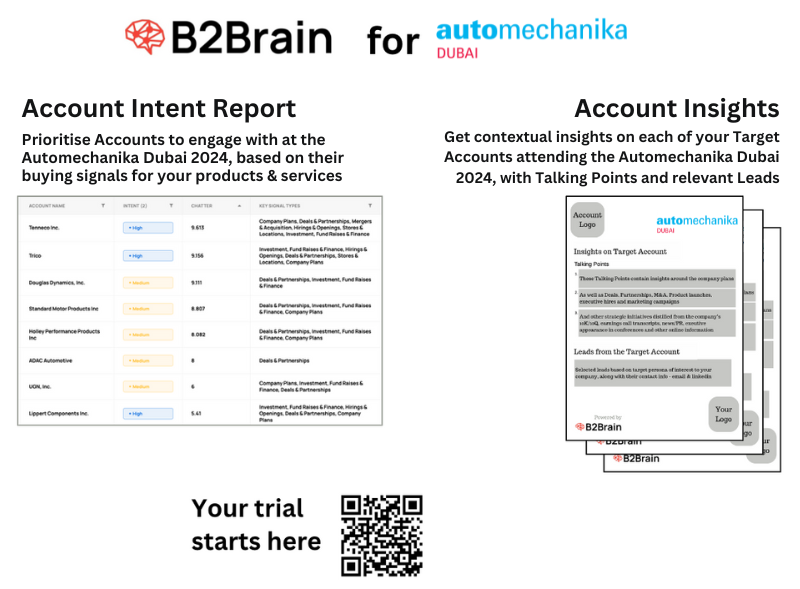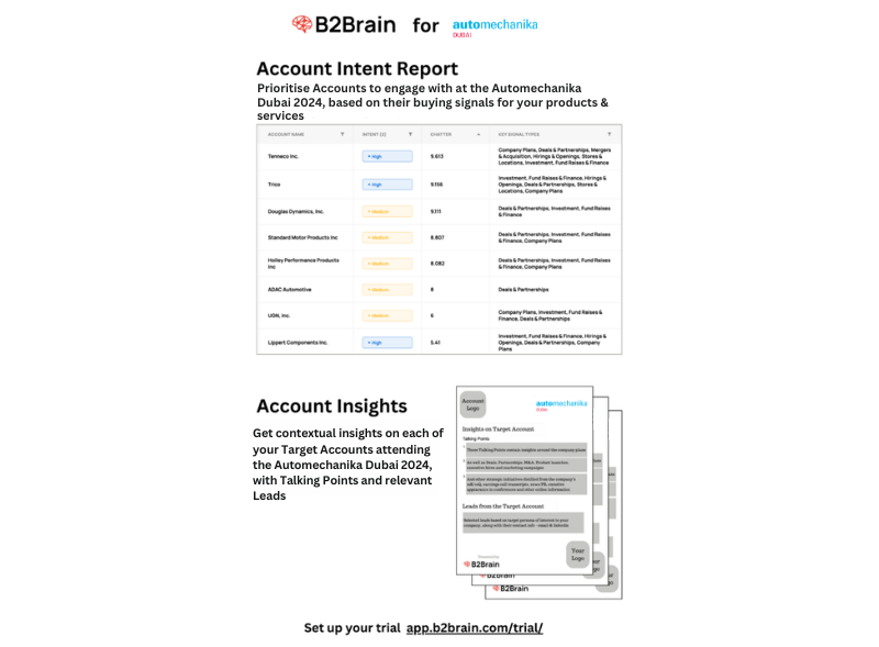 B2Brain’s sales intelligence solutions can help exhibitors at Automechanika Dubai enhance their presence and engagement. By utilizing B2Brain’s account prioritization and intelligence capabilities, companies can identify high-priority accounts and gain valuable insights into their specific challenges and needs. This allows exhibitors to create personalized outreach strategies, craft messaging that resonates with their target audience, and focus on high-impact interactions. By leveraging B2Brain, exhibitors can ensure that their investment in Automechanika Dubai delivers stronger connections, optimized booth interactions, and successful outcomes.