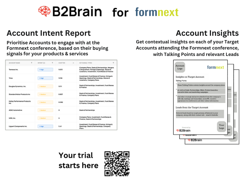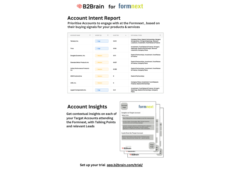 B2Brain’s sales intelligence solutions can empower exhibitors at Formnext to optimize their presence and engagement strategies. By leveraging B2Brain’s account prioritization and intelligence capabilities, companies can identify high-priority accounts and gain deep insights into their specific challenges and needs. This allows exhibitors to craft tailored messaging, engage in more meaningful conversations, and focus on high-value opportunities. With B2Brain, exhibitors can ensure that their investment in Formnext delivers significant returns, leading to stronger connections, optimized interactions, and successful outcomes from their participation in the event.