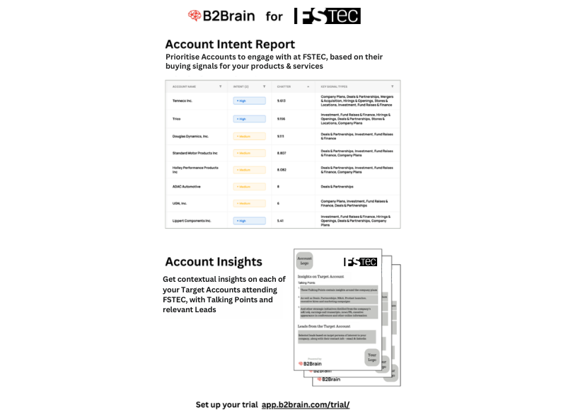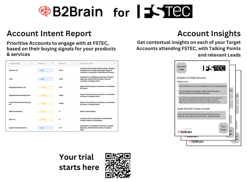 B2Brain’s sales intelligence solutions can make all the difference for exhibitors at FSTEC. Through B2Brain’s account prioritization and intelligence capabilities, foodservice technology companies can focus on high-priority accounts, gaining insights into their specific needs and challenges. This allows exhibitors to tailor their messaging, personalize their outreach, and engage more effectively with prospective clients. By using B2Brain, companies can make better decisions on how to allocate their resources and time, ensuring that their investment in FSTEC delivers maximum returns through stronger connections, enhanced booth interactions, and more successful outcomes.