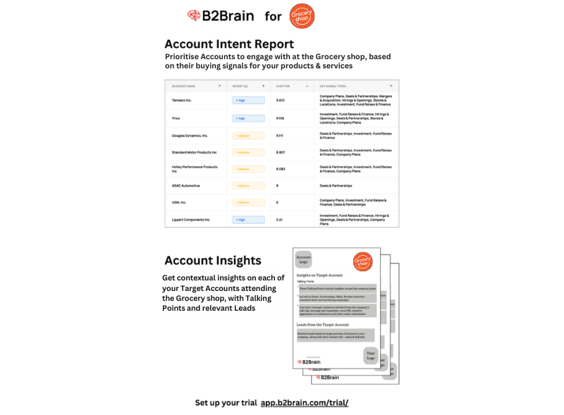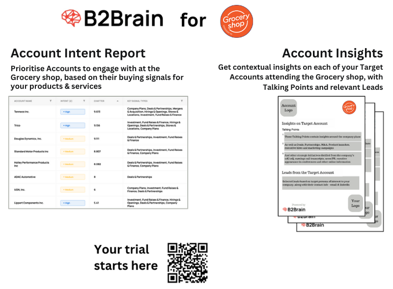 B2Brain’s sales intelligence solutions can provide exhibitors at The Grocery Shop with the tools they need to succeed. By leveraging B2Brain’s account prioritization and intelligence capabilities, companies can identify high-priority accounts and gain insights into their specific needs and challenges. This enables exhibitors to personalize their outreach, create tailored messaging, and engage more effectively with potential clients. With B2Brain, exhibitors can maximize their investment in The Grocery Shop, ensuring more meaningful connections, optimized booth interactions, and stronger outcomes from the event.