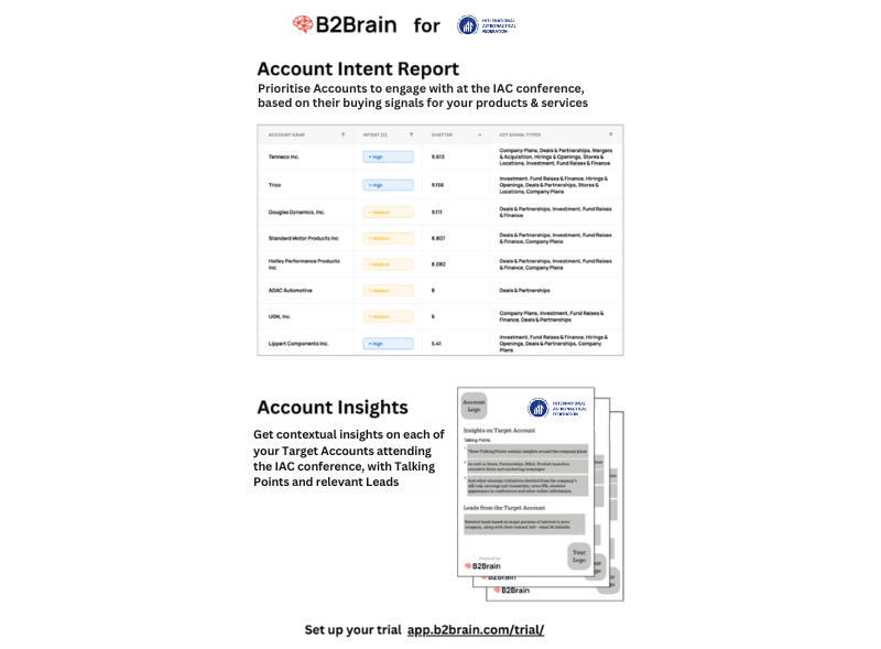 B2Brain’s sales intelligence solutions can help exhibitors at IAC maximize their potential. By leveraging B2Brain’s account prioritization and intelligence capabilities, companies can identify high-priority accounts and gain deep insights into their specific challenges and objectives. This allows exhibitors to tailor their outreach strategies, craft personalized messaging, and engage more effectively with potential clients. With B2Brain, exhibitors can ensure that their participation in the International Astronautical Congress leads to stronger connections, optimized interactions, and successful outcomes, making the most of their investment in this global event.