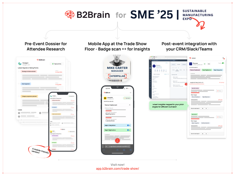 B2Brain’s sales intelligence solutions can help exhibitors at the Sustainable Manufacturing Expo optimize their engagement strategies. By leveraging B2Brain’s account prioritization and intelligence capabilities, companies can identify high-priority accounts and gain insights into the specific sustainability challenges faced by their target audience. This allows exhibitors to create personalized messaging, focus on high-impact opportunities, and engage in more meaningful conversations. Utilizing B2Brain ensures that exhibitors maximize their investment in the Sustainable Manufacturing Expo, resulting in stronger connections, optimized booth interactions, and successful outcomes.